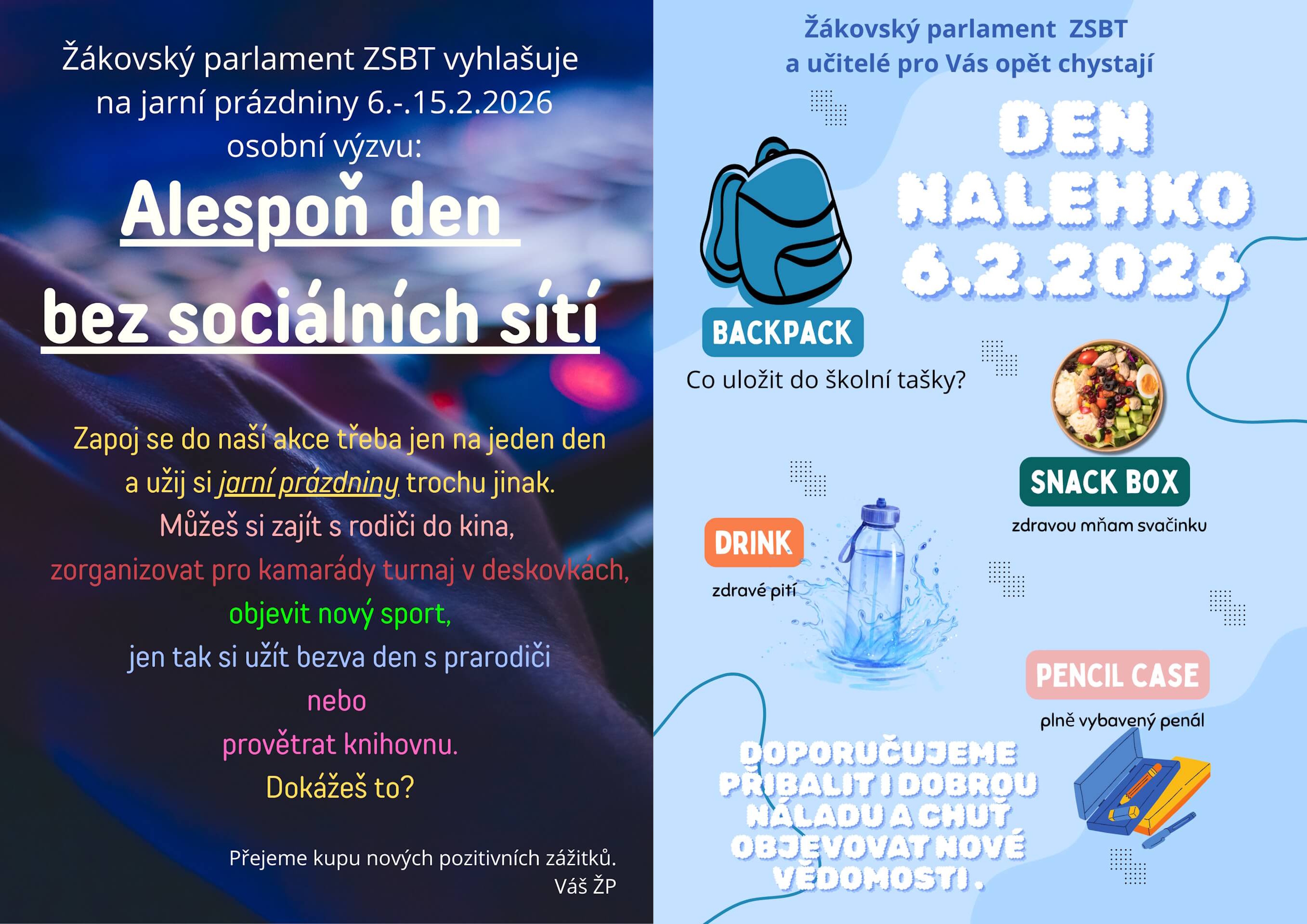 Jak už je naší milou tradicí, během školního roku se ŽP snaží zpestřit školní dny nejrůznějšími aktivitami. Tentokrát ovšem přichází novinka – připravili jsme akci, která bude probíhat během jarních prázdnin! Zkuste si na chvíli dopřát „digitální detox“: odložte mobil, vypněte počítač a vydejte se vstříc dobrodružství, která na vás venku čekají.